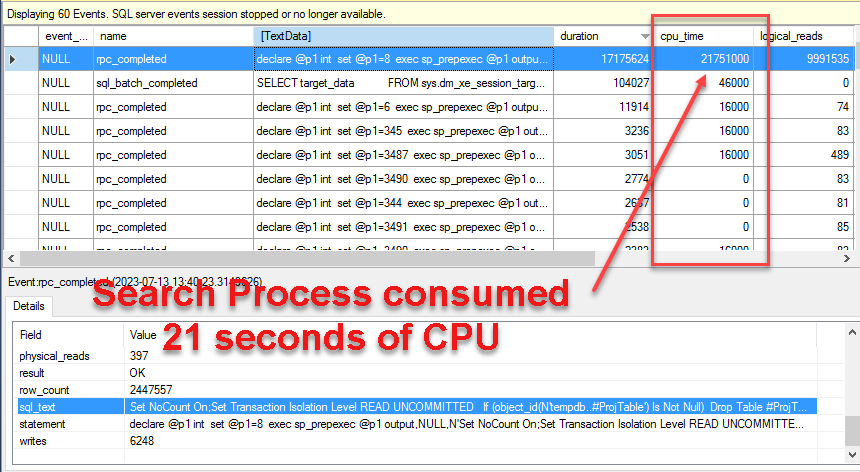XEvent Profiler é baseado em Extended Events usando dois templates customizáveis de Extended Events chamados QuickSessionStandard e QuckSessionTSQL. Revise o artigo da base de conhecimento QA00000117731 para obter detalhes sobre como usar eventos estendidos. O XEvent Profiler fornece uma exibição ao vivo dos eventos capturados. Depois de interromper a captura, os eventos podem ser classificados por valores de coluna para determinar o alto uso da CPU. A imagem abaixo mostra um processo com duração de 25 segundos.