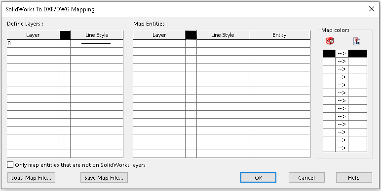 NOTA: No desenho do SOLIDWORKS®, se as entidades estiverem em combinação de SOLIDWORKS Layers e Default Layer e se novas camadas forem definidas na janela 'SOLIDWORKS To DXF/DWG Mapping' para cada entidade existente no desenho, marque a opção 'Somente entidades de mapa que não são em camadas do SOLIDWORKS só aplicará novas camadas a entidades que estão na camada padrão no desenho do SOLIDWORKS®.