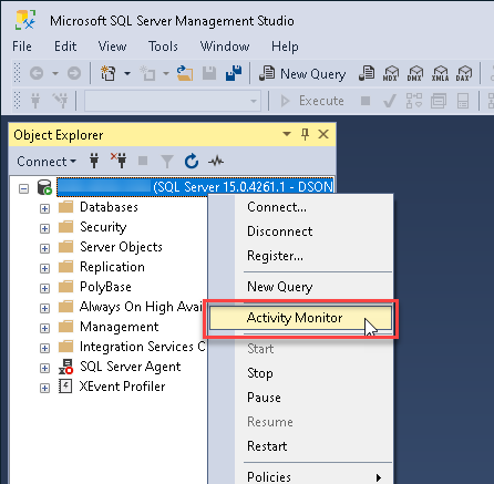 Activity Monitor é uma maneira rápida de obter um uso geral da CPU pelo serviço SQL Server. Após iniciar e conectar-se à instância do SQL Server, clique com o botão direito do mouse no servidor e selecione a opção 'Monitor de atividades'.