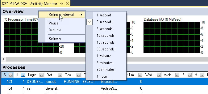 O SSMS exibe as atividades para um intervalo de tempo definido. O intervalo pode ser alterado clicando com o botão direito do mouse no cabeçalho 'Visão geral' e selecionando a opção 'Atualizar intervalo'.