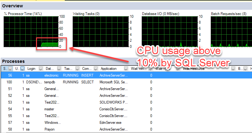 3. Obtenção de informações de utilização da CPU para o banco de dados do SOLIDWORKS ® PDM
