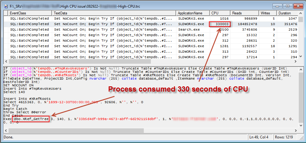 O SQL Server Profiler permite capturar detalhes do uso da CPU para processos SQL para um ou vários bancos de dados. Revise o artigo da base de conhecimento QA00000112812 para obter detalhes sobre como configurar e usar o SQL Profiler corretamente. As informações de uso da CPU junto com outras métricas que podem ser úteis na solução de problemas de desempenho. Essa ferramenta foi projetada para capturas de curto prazo e a execução desse longo prazo pode afetar o desempenho geral do SQL Server. Use Evento Estendido para monitoramento de longo prazo. A imagem abaixo mostra o procedimento armazenado XRef_GetTree com duração de mais de 330 segundos.