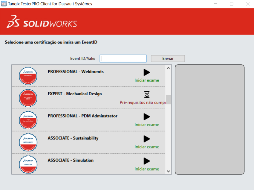 Para ativar o voucher que você recebeu, basta inseri-lo no campo "Event ID/Vale" e enviar. Depois disso, os respectivos exames referentes ao nível do voucher estarão disponíveis. Nesse momento, você poderá ver todos os exames da Dassault Systèmes.