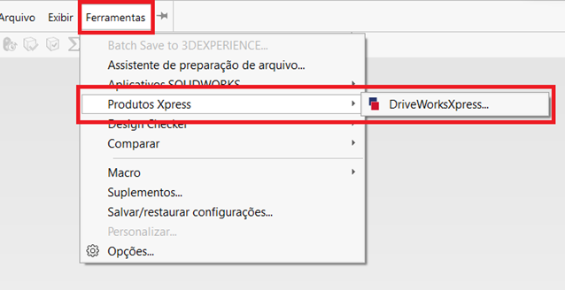 - Clique em Ferramentas > Produtos Xpress > DriveWorksXpress